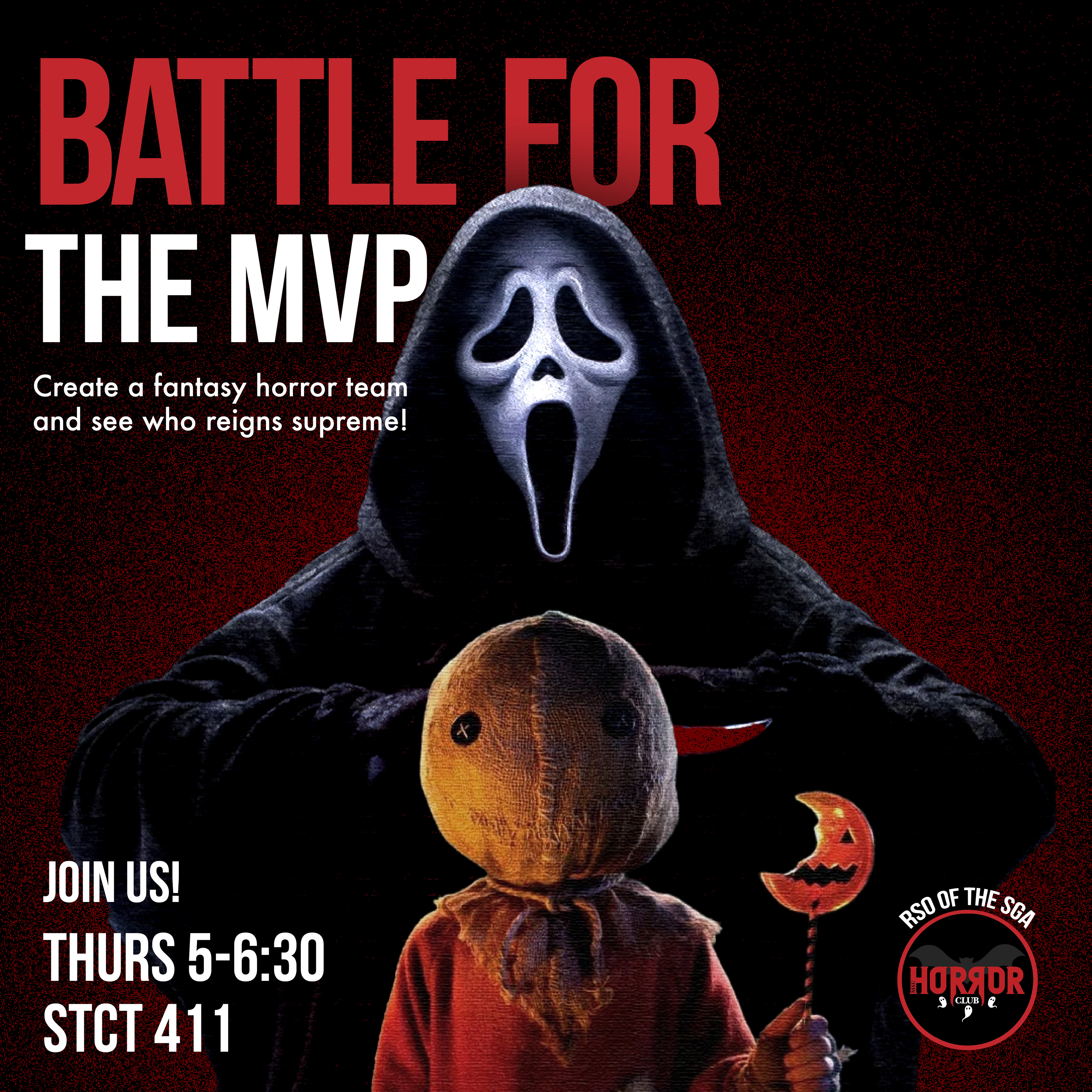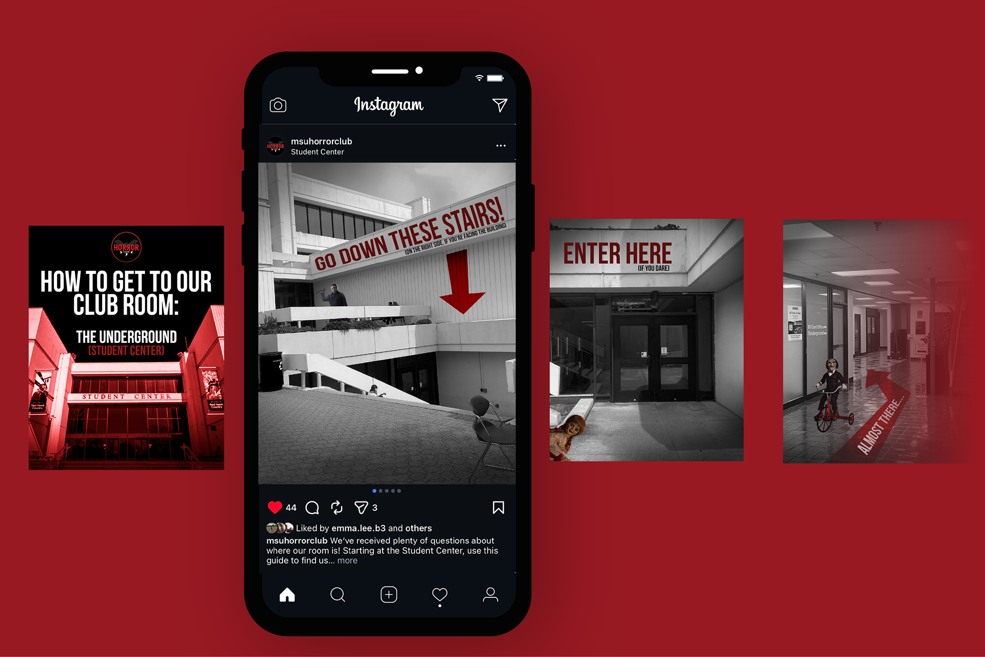 To drive participation and build excitement for MSU Horror Club events, I designed a series of Instagram posts promoting weekly meetings and special activities. Each post emphasized clear messaging, bold visuals, and consistent branding to stand out in students’ feeds.